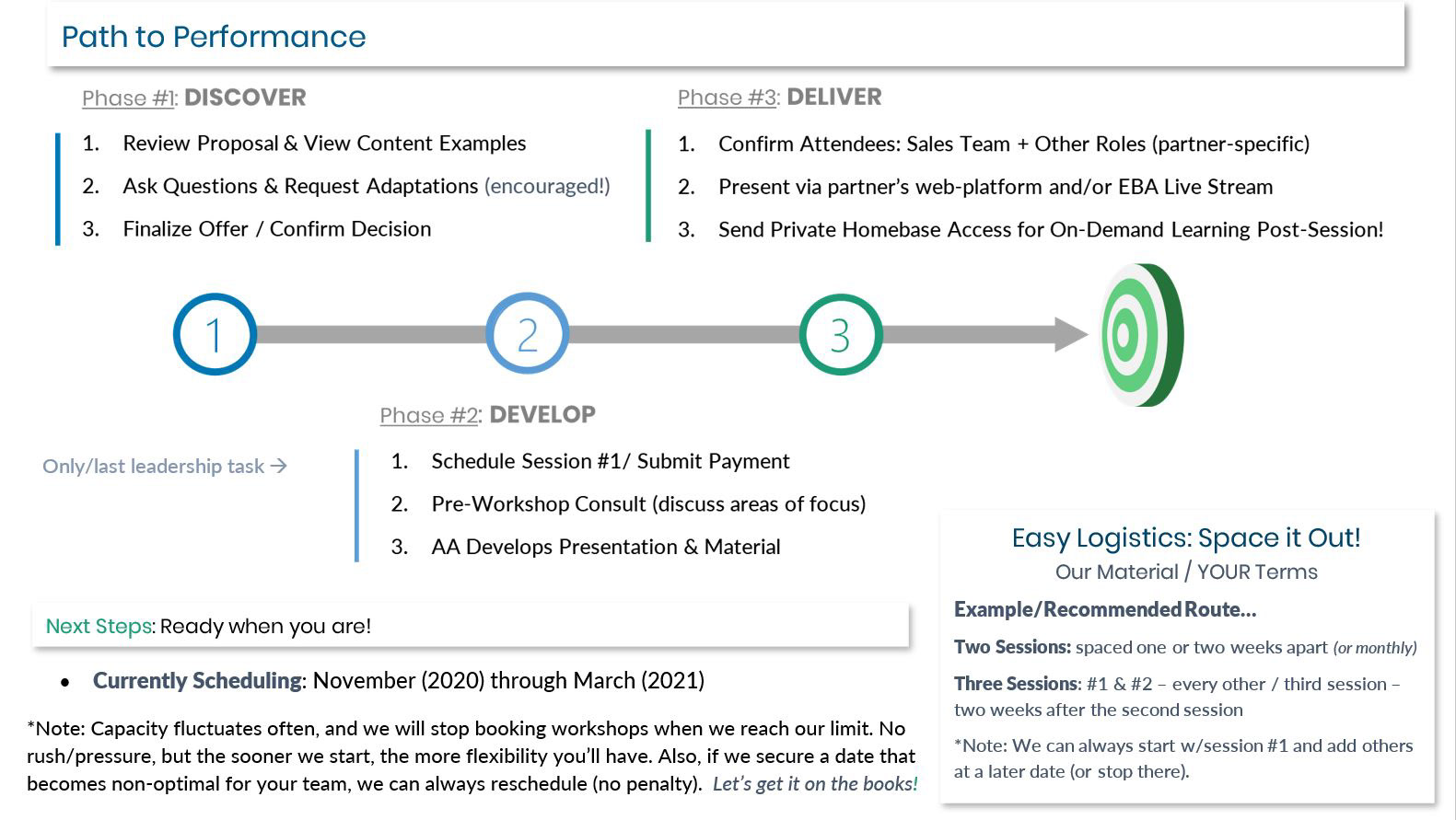 Aside from scheduling and showing up on game day, this program requires little to no work for leadership or the sales team. Our job is to provide the information upfront and supply resources that allow the team to leverage the material as their situation & interest-level dictates. Execute on your terms!